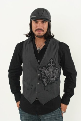 Royal Testament Rocker Vest in Grey Cotton Twill with Black Satin Accents and lining. It has a Sword Shield Design embroidered on it and has pewter tone metal buttons with a Royal Shield design. It has two front pockets. This versatile Rocker Style vest looks great buttoned or unbuttoned, over a t shirt or a button front shirt. Wear it with an untucked button front shirt for the current fashion look as seen on our model. Somewhat fitted when worn buttoned closed. Our model who wears a size Medium Shirt or Size 40 jacket is wearing the size Medium.